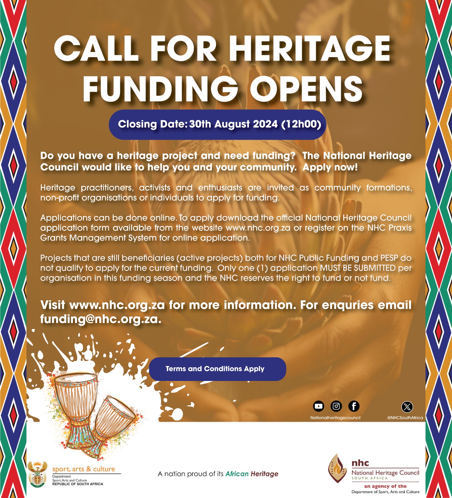 The National Heritage Council of South Africa (NHC) an entity of the Sport, Arts and Culture Department has opened a call for Heritage Funding applications to worthy community projects in the heritage sector that seek to preserve and promote our country’s heritage through documentation, research and publication. The closing date for applications is 30 August 2024.